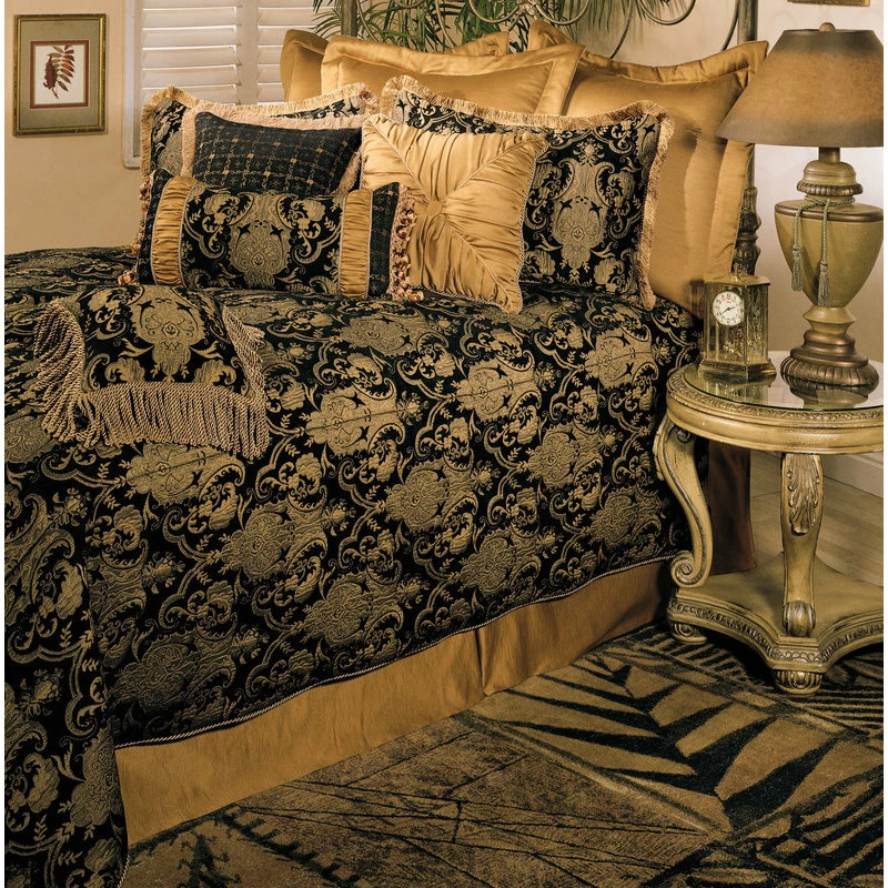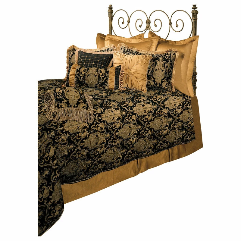The Sherry Kline China Art bedding collection features a flowing Asian-inspired jacquard design in dark burgundy black and golds. This bedding set includes comforter, bedskirt, shams and two decorative pillows.