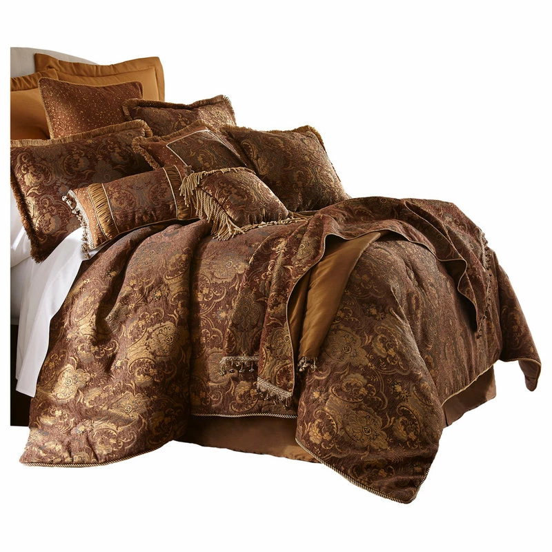 The Sherry Kline China Art bedding collection features a flowing Asian-inspired jacquard design in dark brown and golds. This bedding set includes comforter, bedskirt, shams and two decorative pillows.