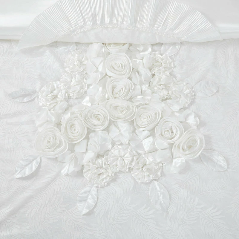 This set will make any home feel like an elegant ballroom. Impress your guests with the stylish ruffles. Beautifully decorated with matching white flowers, this delicate but durable set will make you sleep like royalty. Available in three different sizes to accommodate any setting: Cal King, King, Queen. Every set includes: 1 Comforter , 2 Pillow Shams, 2 Cushion Cover, 1 Neck Roll.