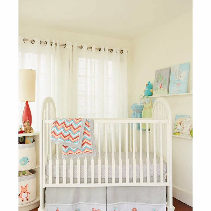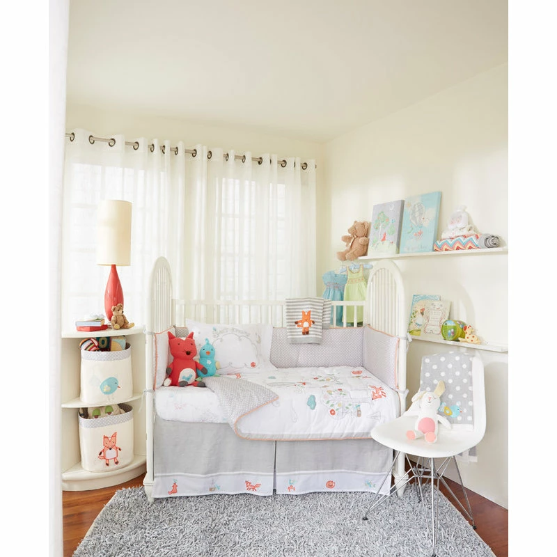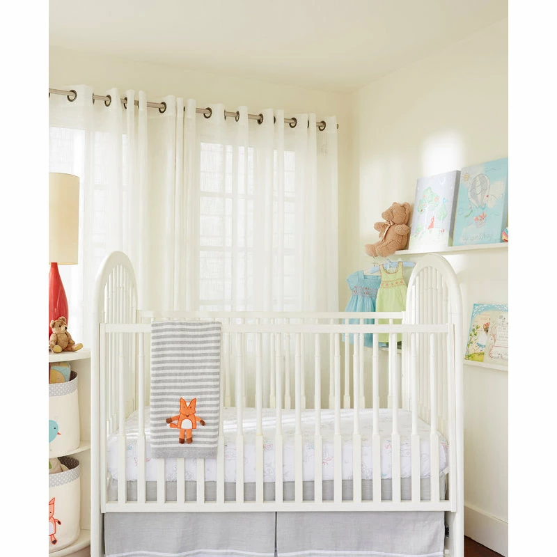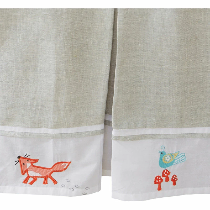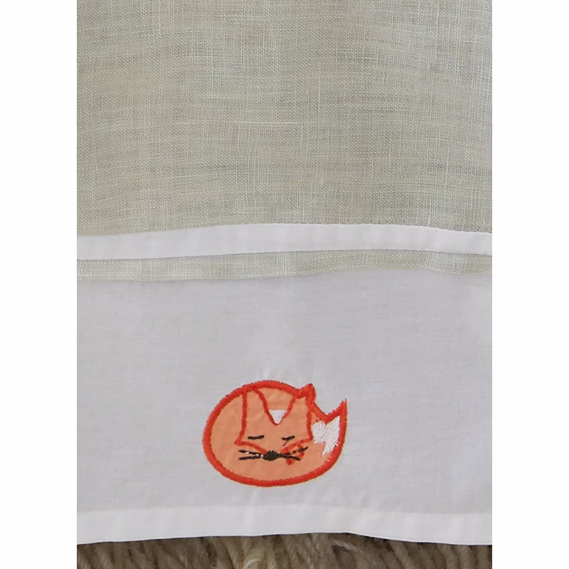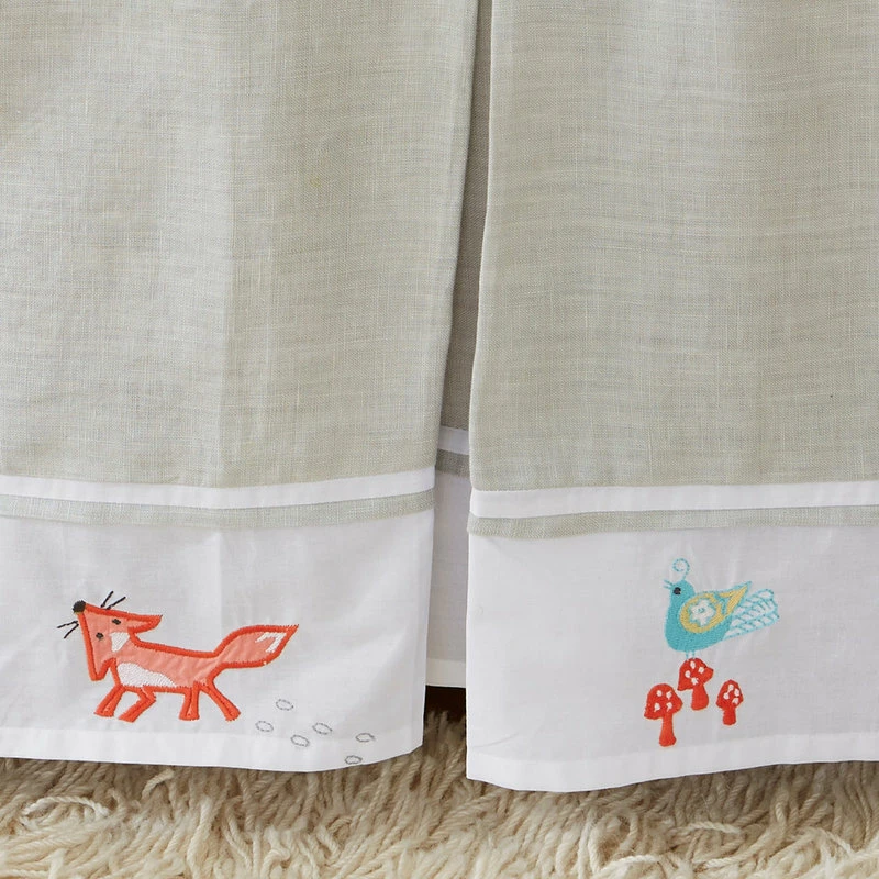 What if you don’t use a bumper but you want something decorative for the crib? Now you can design your crib with a modern and sophisticated crib-skirt of 100% natural grey linen with a clean white percale border. Fox and the Finch are whimsically hand appliqued and embroidered within the white border of both long sides and short sides of this sophisticated tailored inverted pleated crib skirt. Charming addition to the Fox and the Finch nursery and toddler bedding, as well as the perfect coordinate to our Fox Toile and Clouds crib sheets.