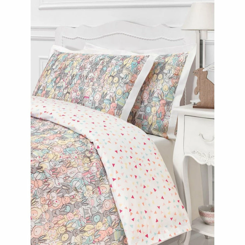 Cheerful children’s ornament of this double-sided bed linen, cute colorful bunnies, will please both kids and older children. The print of the set resembles the drawings in the children’s album with their spontaneity, simple lines and bright colors. Cute bunnies, which seemed to come from a children’s cartoon, decorate the fabric of the duvet cover and pillowcases and create a fun and positive mood, as well as help kids love and protect animals. The reverse side of the duvet cover is decorated with small geometric patterns and allows you to create different combinations, changing the appearance of the kit. Material linen “Funny bunnies” – silky and pleasant to the touch cotton satin, durable and practical to use. This fabric is not deformed and does not shrink, the colors do not fade even after numerous washings.