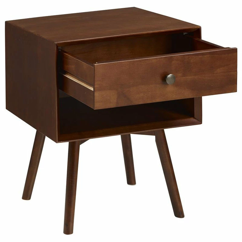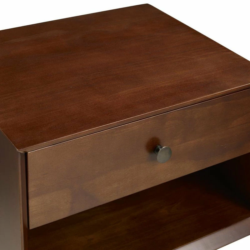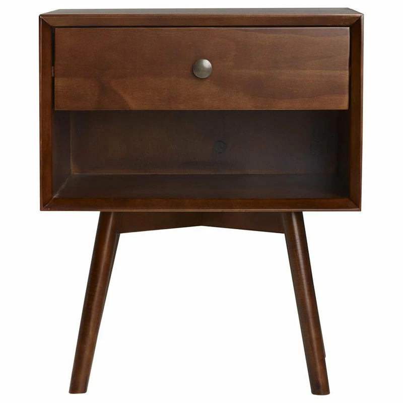 Looking for a side table that won’t weigh down your space? This mid-century modern nightstand made of beautifully stained pine and antique-finished metal hardware could be the one for you. With beveled front details, open and closed storage for easy accessibility, and its solid wood make-up, this piece is a triple threat of character, function and durability. Made of wood responsibly harvested from renewable forests, this eco-friendly nightstand will allow your environmental conscience to sleep easier. Plus, assembly is a piece of cake—just add legs to the top portion and you’ll be good to go.