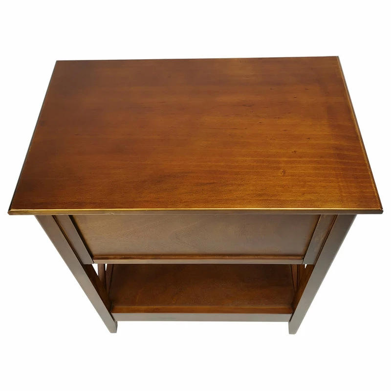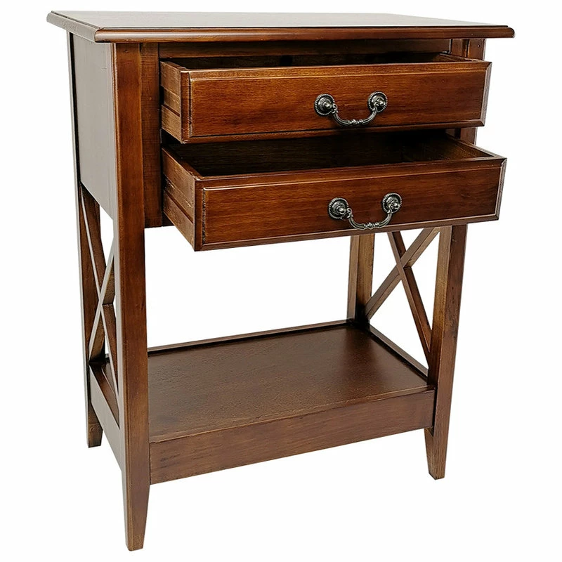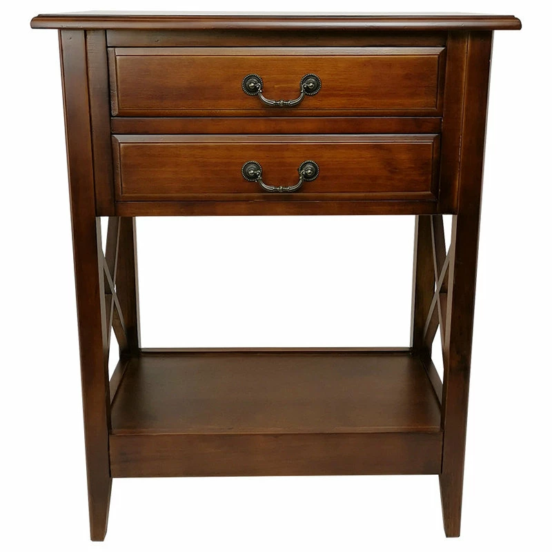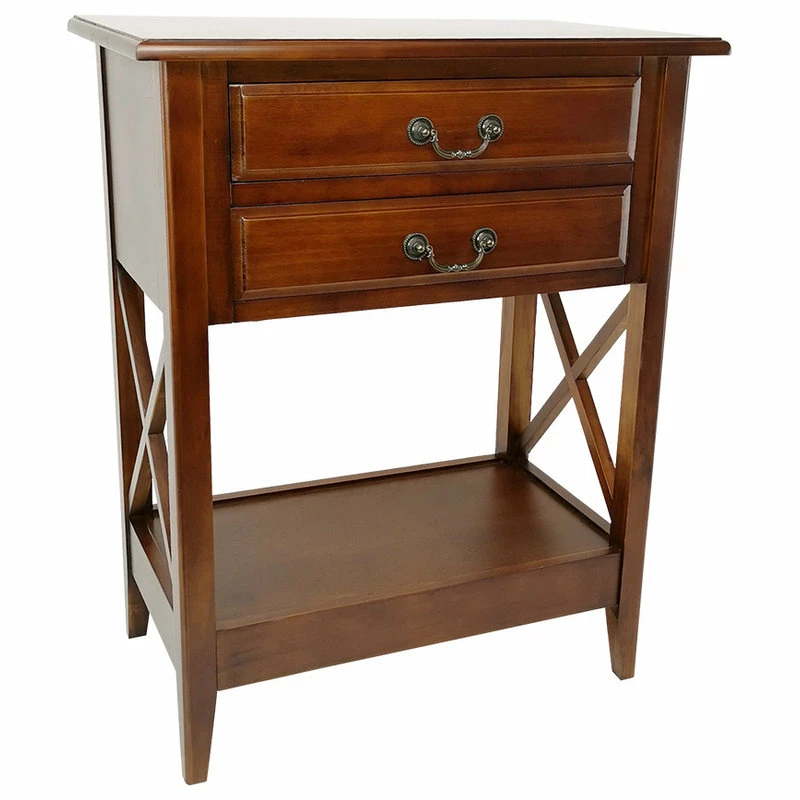 Effortlessly enhance the visual appeal of your traditional styled bedroom with the addition of our Eiffel Nightstand. This 2-drawer, 1-shelf accent table features a warm cherry finish with brass hardware and “x” side panels that lends it a classic and homey feel. Host photographs, a table lamp or flowers on its spacious top to take this piece to new heights.