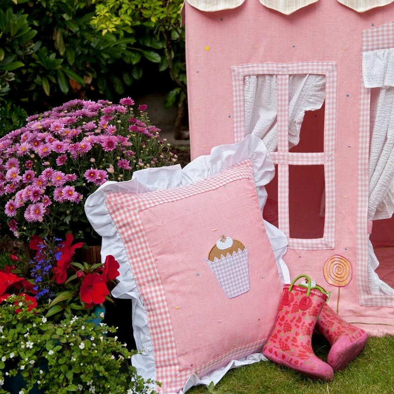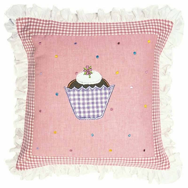 Our Gingerbread Cushion Cover is appliqued and embroidered with a yummy cupcake and a dusting of multi-coloured dots. Finished with a rose mini-gingham border and a pretty frill trim.